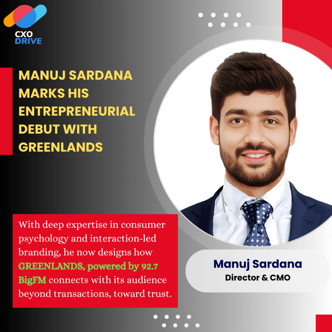 With nearly 15 years of shaping brand narratives and consumer engagement across real estate and experiential marketing, Manuj Sardana steps into entrepreneurship as Director & CMO at GREENLANDS, powered by 92.7 BigFM. In this role, he is defining the company’s brand philosophy and communication architecture from inception — building its positioning, crafting its storytelling framework, and designing scalable outreach strategies that ensure the venture is not just introduced to the market, but distinctly remembered.